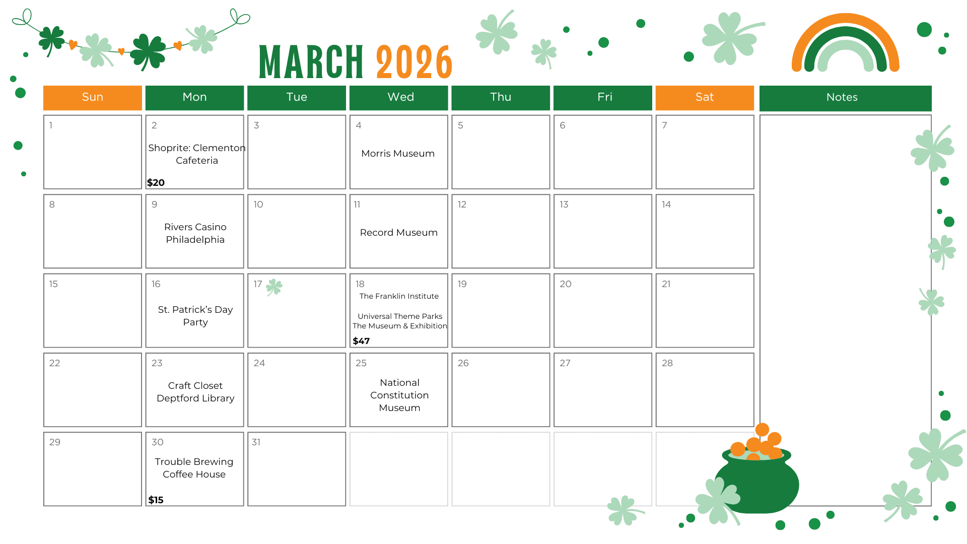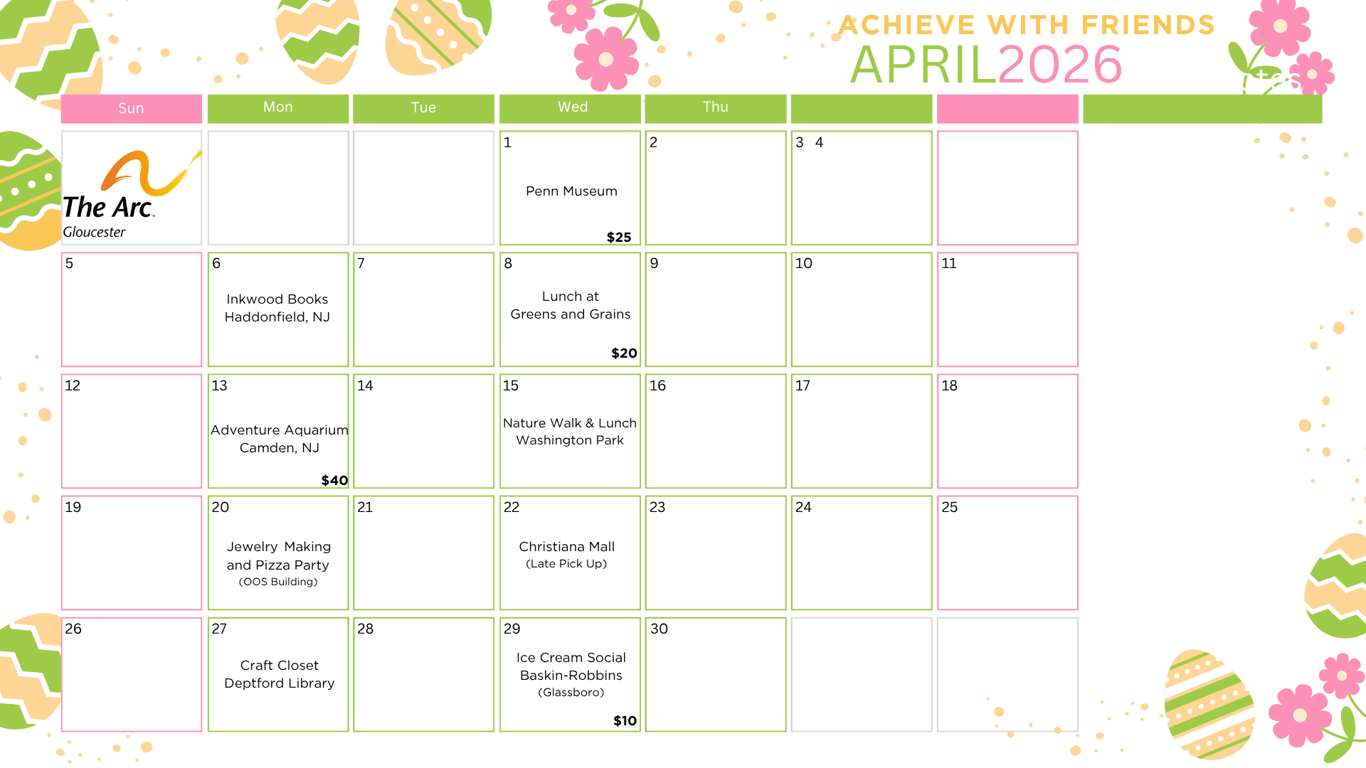 Activities will be held from 10am-1pm. Pick up and drop off will be held from The Arc Gloucester's Office of Support Services (1180 N. Delsea Dr. Westville, NJ 08094)